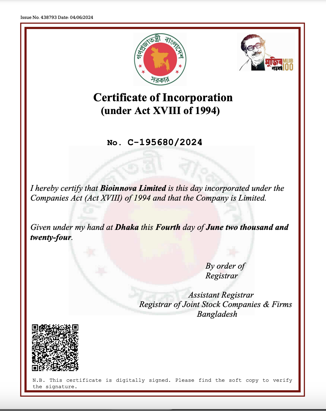BioInnova Limited was officially established as a registered company in Bangladesh, marking a significant milestone in its journey to becoming a trusted name in product sourcing and innovation. The company received its Certificate of Incorporation under the regulatory framework of the Registrar of Joint Stock Companies and Firms (RJSC), a testament to its legal status and adherence to the business laws of the country.